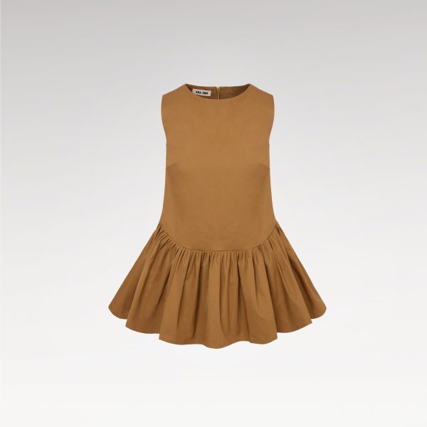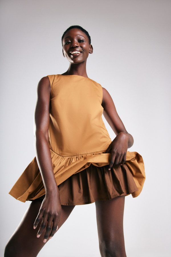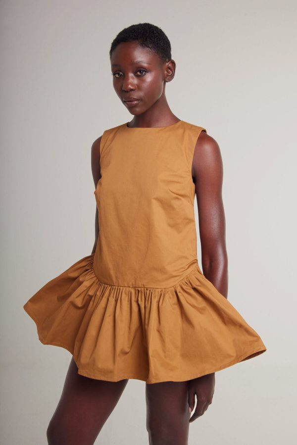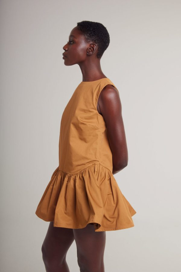 A playful yet refined design, this sleeveless dress is crafted from structured cotton in two perfectly matched brown tones. The frill detailing adds a dynamic, feminine touch, while the short silhouette brings a youthful, modern edge. A hidden tonal back zipper ensures a sleek, seamless finish, while the luxury soft cotton lining enhances both comfort and sophistication. Effortlessly blending fun with elegance, this dress offers the perfect balance of fine craftsmanship and vibrant, contemporary style.